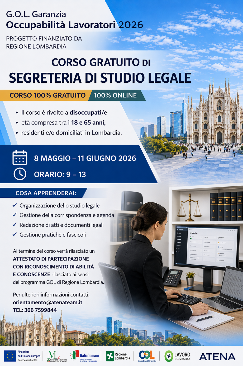 Segreteria di studio legale Dal 6 maggio all’11 giugno – 100h – 100% online – orario part time (9-13) Consulta la locandina (png - 2 MB)