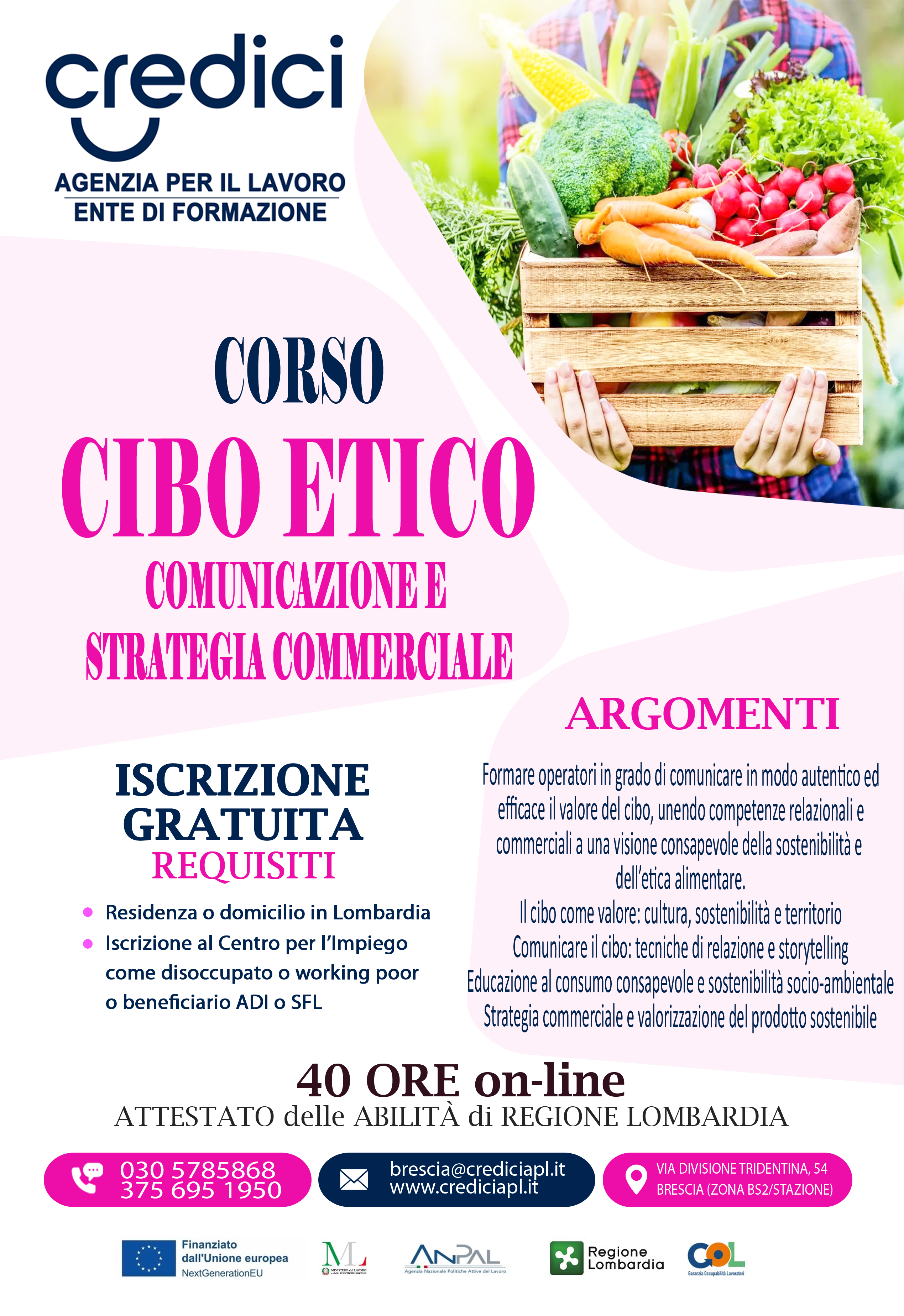 Locandina Corso GOL "Cibo etico" per disoccupati Periodo: dal 07.04.2026 Durata: 40 ore Dove: ONLINE, con Assopadana Per maggiori dettagli, consultare la locandina Locandina e calendario del corso (png - 3 MB)