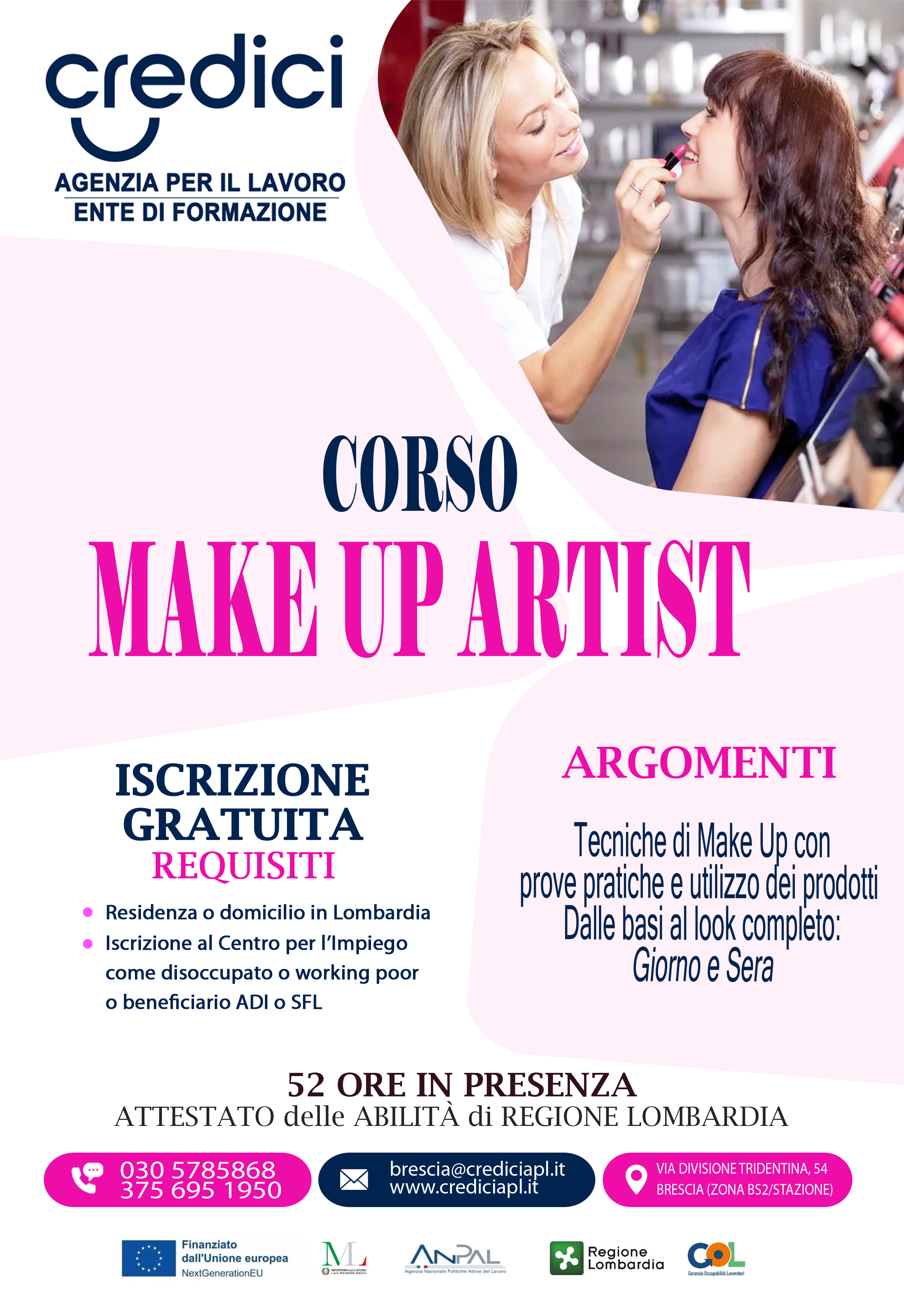 Locandina Corso GOL "Make Up Artist" per disoccupati Periodo: dal 07.04.2026 Durata: 52 ore Dove: AULA, VIA DIVISIONE TRIDENTINA 54, BRESCIA Per maggiori dettagli, consultare la locandina Locandina e calendario del corso (png - 3 MB)