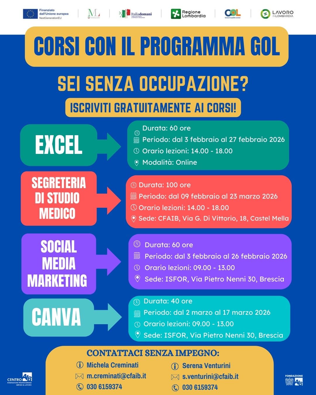 Corsi GOL Fondazione AIB organizza vari corsi GOL in partenza a febbraio: Sede: corsi in presenza e corsi online Per info, consultare la locandina corso gol (jpg - 199 KB)