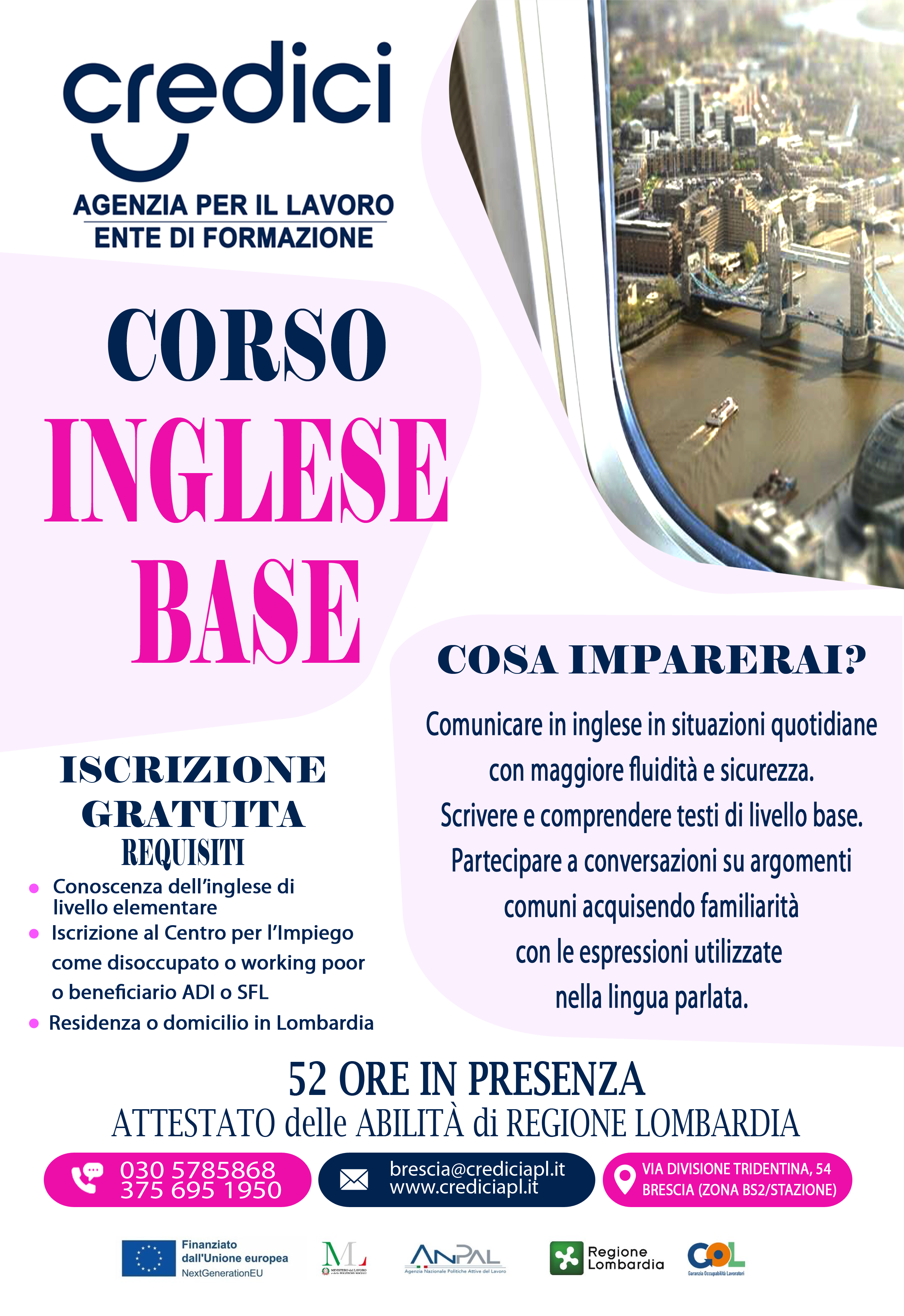 Corsi Gol Atena organizza un corso di "INGLESE BASE ED I" a titolo gratuito Periodo: inizio il 13/04/2026 Durata: 52 ore Modalità: in presenza. c/o Credici VIA DIVISIONE TRIDENTINA 54, BRESCIA Per maggiori informazioni, consultare la locandina CORSI GOL (png - 3 MB)