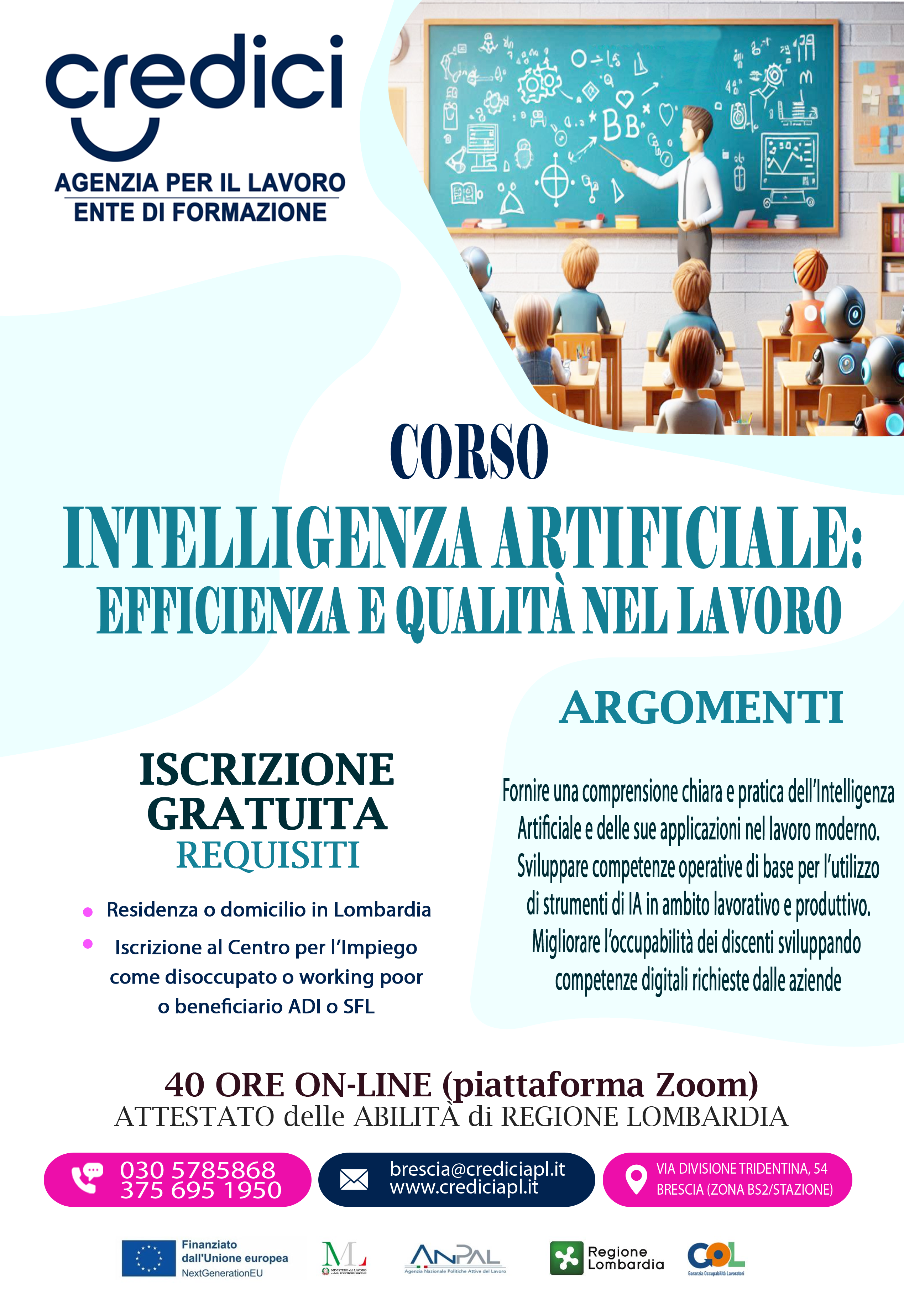 Corsi Gol Atena organizza un corso di "Intelligenza artificiale" a titolo gratuito Periodo: inizio il 7 APRILE 2026 Durata: 40 ore Modalità: ONLINE (PIATTAFORMA ZOOM) Per maggiori informazioni, consultare la locandina CORSI GOL (png - 3 MB)