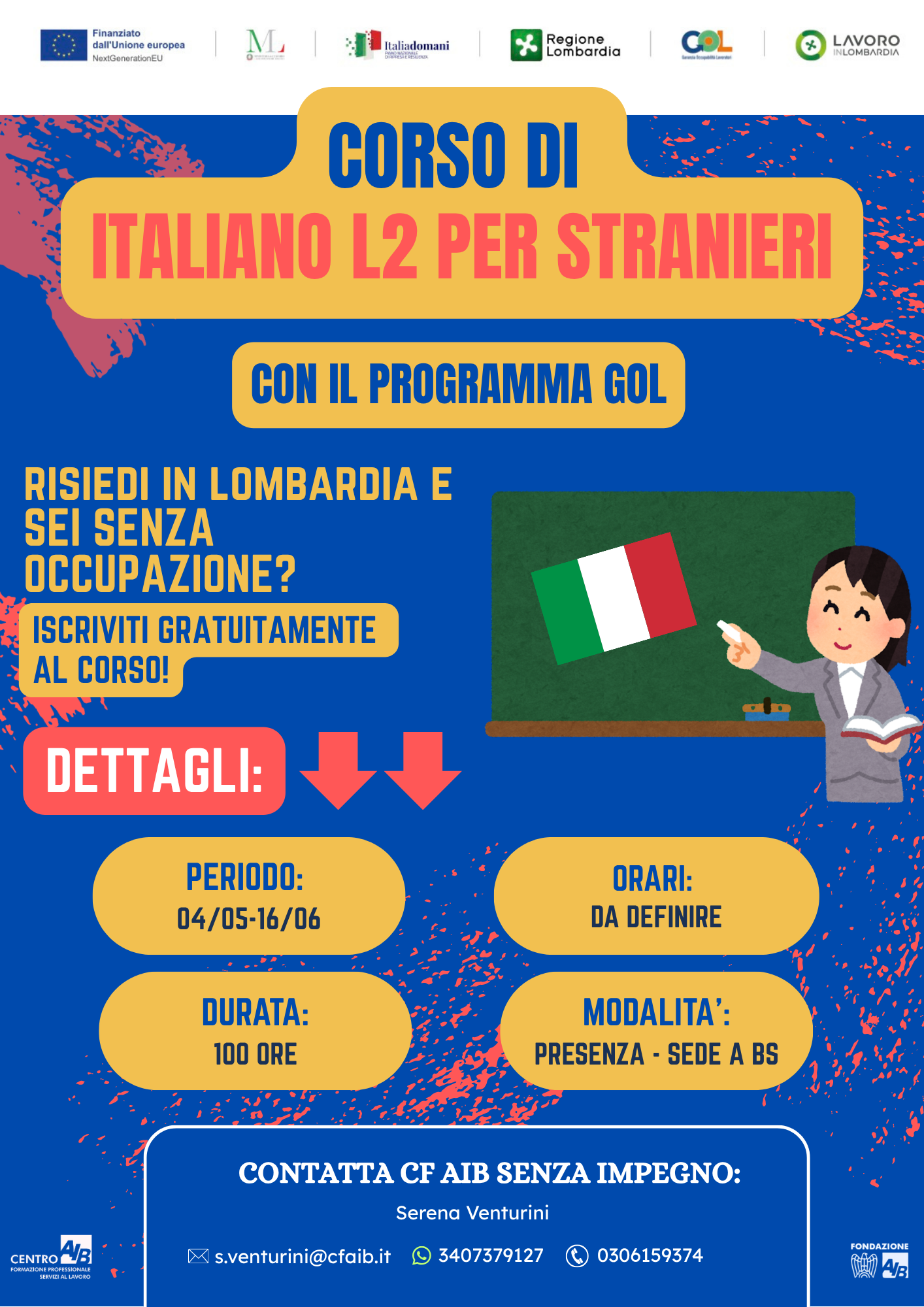 Corso Gol: Italiano L2 per stranieri Corso Gol: Italiano L2 per stranieri Corso di base di alfabetizzazione italiana Data Di Inizio: 04 maggio 2026 Modalità Di erogazione: presso la sede di Brescia, via P. Nenni 30 Durata: 100 ore Contatti sulla locandina. Locandina (png - 666 KB)