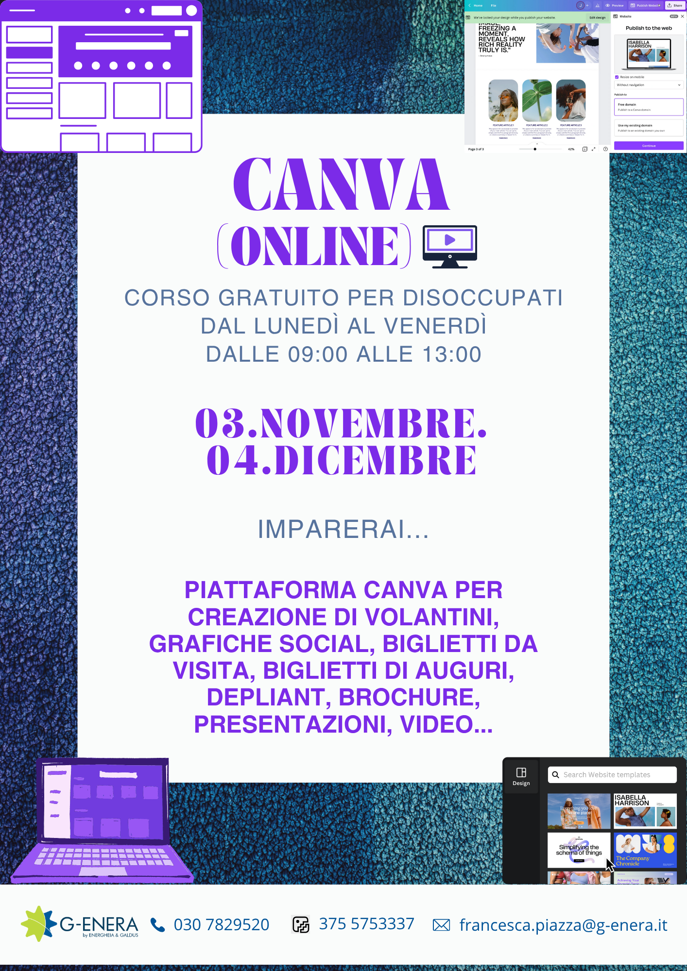 Locandina G-ENERA organizza un corso di CANVA Online Data: dal 3 novembre al 4 dicembre Durata: 40 ore dal lunedì al venerdì dalle 09:00 alle 13:00 Locandina (png - 2 MB)