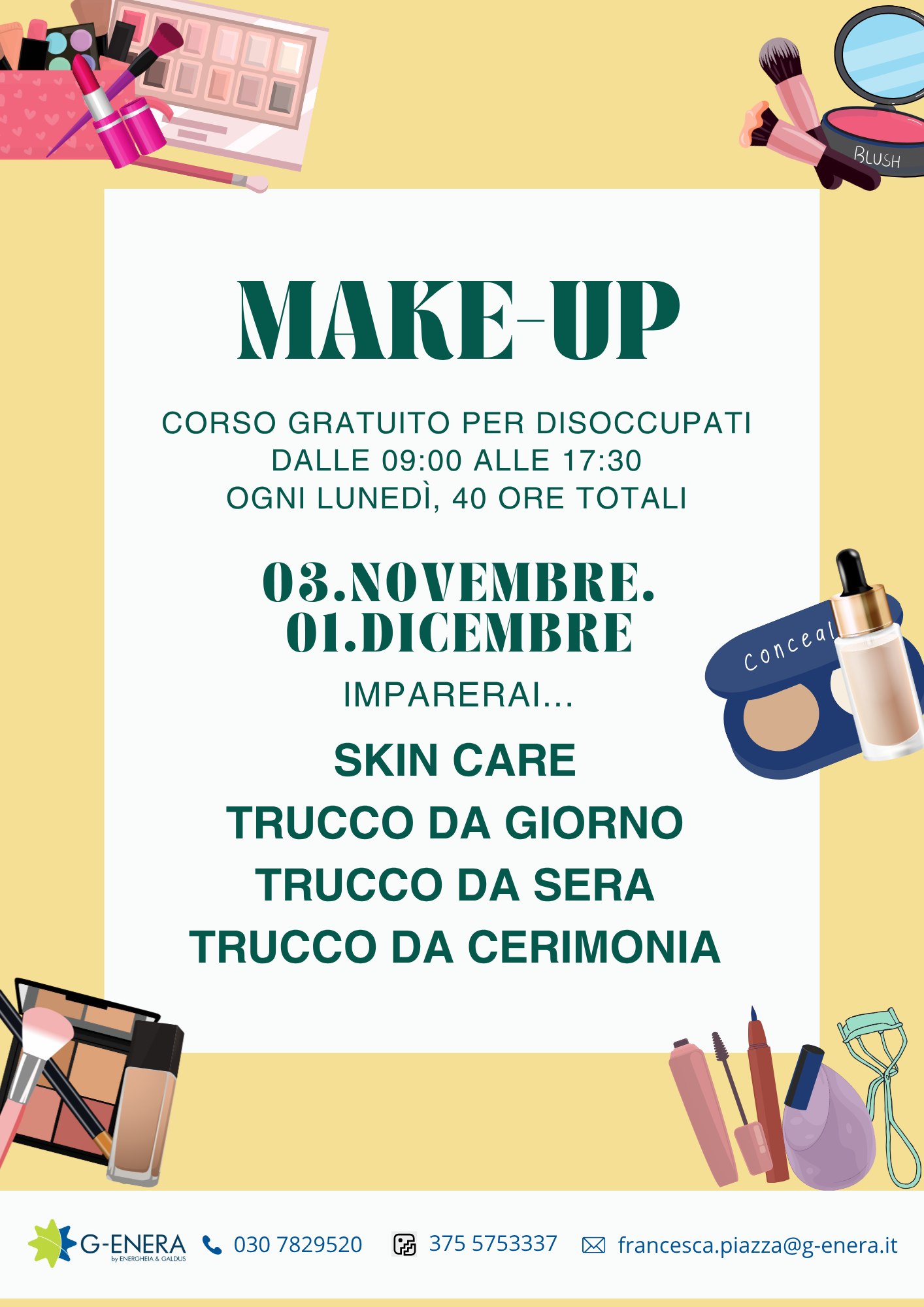 Locandina G-ENERA organizza un corso di Make-UP Data: dal 3 novembre al 1 dicembre Durata: 40 ore ogni lunedì dalle 09:00 alle 17:30 Sede: in presenza Locandina (png - 404 KB)