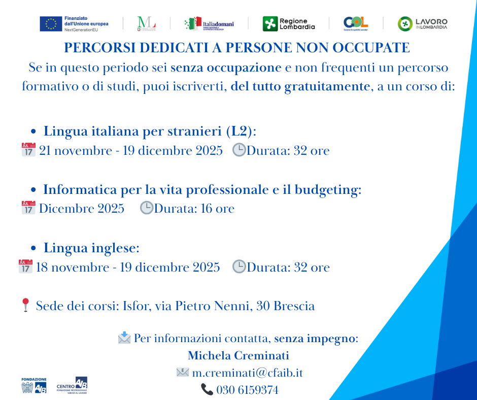 Locandina Fondazione AIB organizza diversi corsi in partenza a novembre e dicembre per disoccupati: Lingua Italiana per Stranieri: dal 21 novembre al 19 dicembre (32 ore) Informatica per la vita professionale e il budgeting: dicembre 2025 (16 ore) Lingua Inglese: dal 18 novembre al 19 dicembre (32 ore) Sede: in presenza Locandina (png - 143 KB)