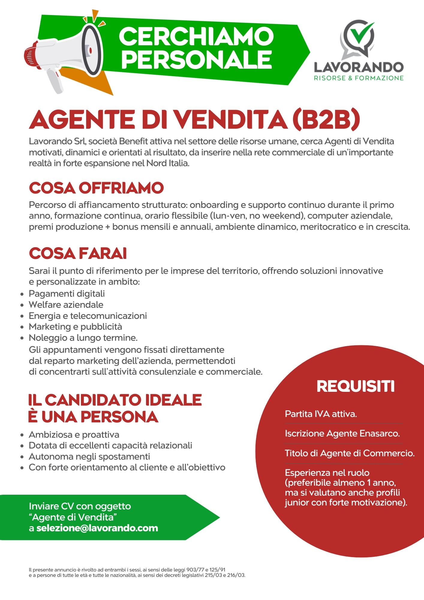 Cosa si ricerca LAVORANDO Risorse & Formazione riceca agenti di vendita per realtà in forte espansione nel Nord Italia.Scarica la locandina per maggiori informazioni. Scarica la LOCANDINA LOCANDINA Agenti di vendita (jpg - 449 KB)